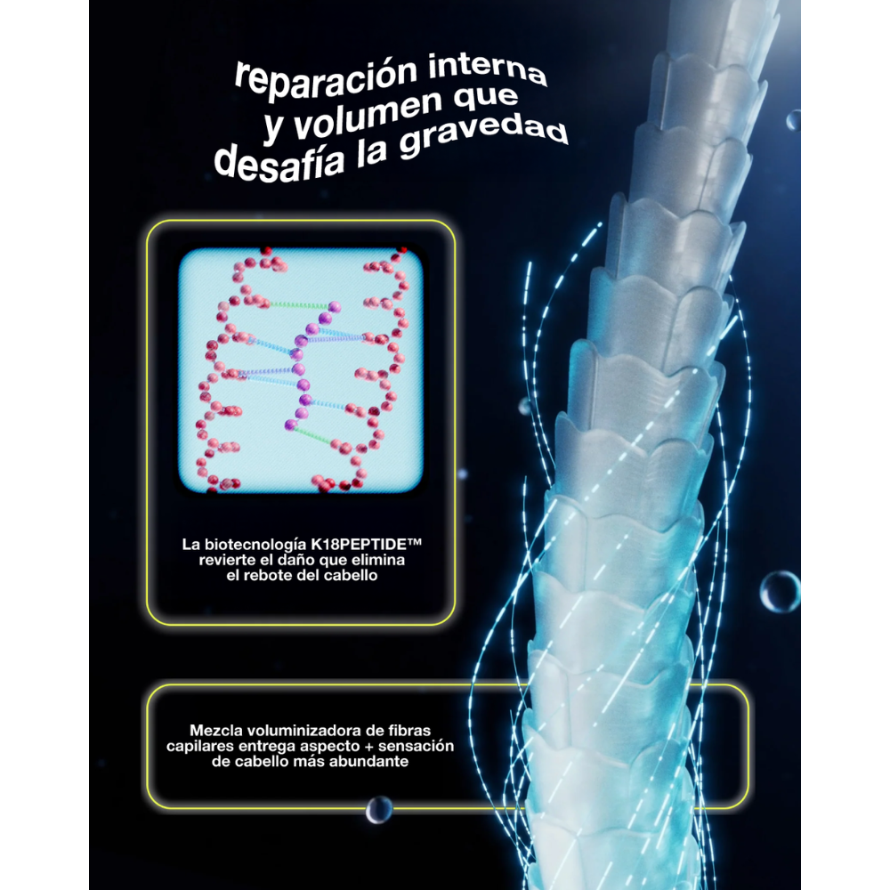 Spray voluminizador ligero y construible, potenciado con el K18PEPTIDE™, que ayuda a revertir el daño, especialmente en cabellos finos, frágiles o maduros. Formulado con una mezcla voluminizadora que actúa sobre la fibra capilar para que el cabello se vea y se sienta más abundante, aportando un volumen flexible y manejable desde la raíz hasta las puntas hasta por 2 días.