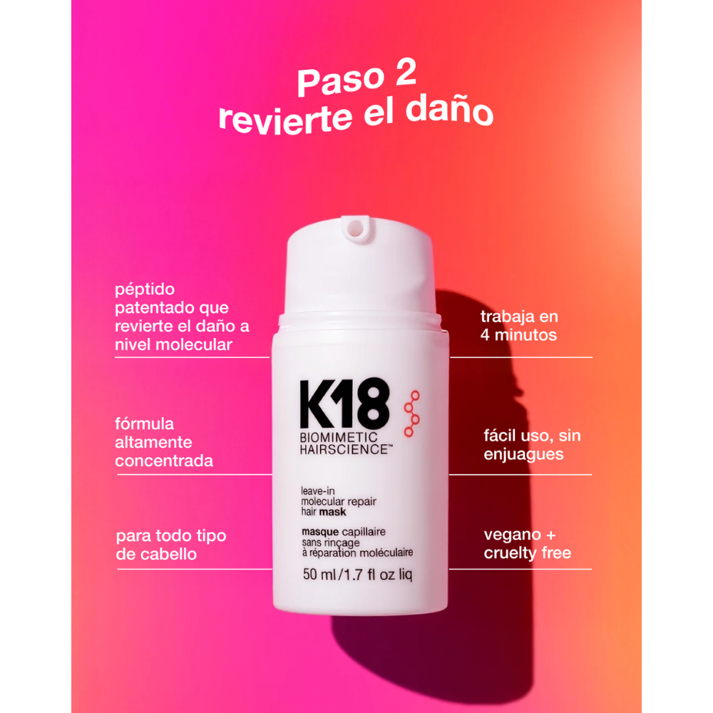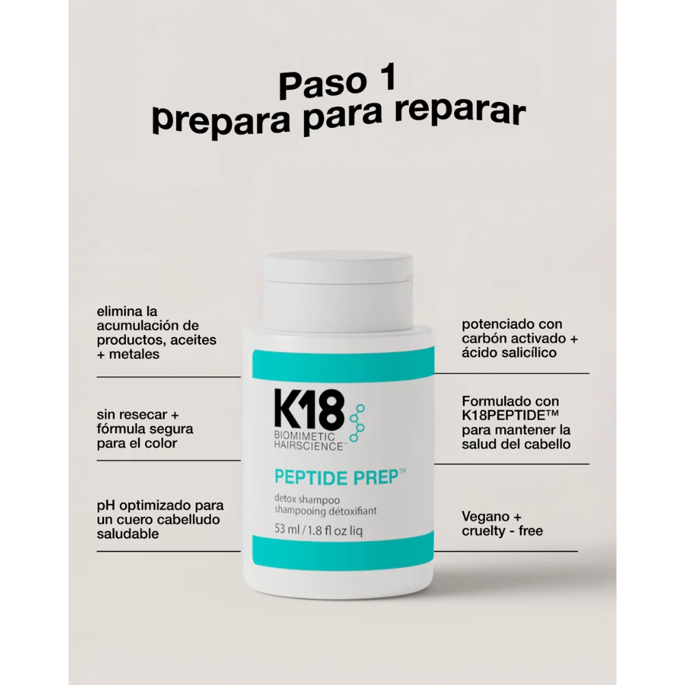 Comienza con nuestro shampoo detox para eliminar la acumulación de producto, exceso de aceite y los metales del agua dura. continúa con la máscara de reparación molecular, potenciada con el K18PEPTIDE™ y clínicamente probada para revertir el daño por decoloración + color, servicios químicos y calor* en 4 minutos.